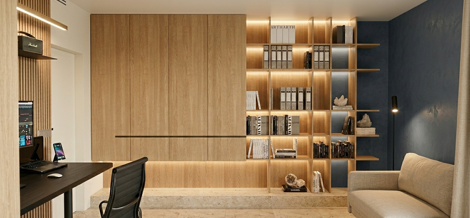 Wnętrza utrzymane są w duchu japandi – harmonijnym połączeniu spokojnego japońskiego minimalizmu ze skandynawską elegancją. Postawiliśmy na prawdziwość materiałów takich jak surowy kamień, naturalne drewno o głębokim usłojeniu czy lniane tekstylia. Wielkie okna kadrują widoki na okoliczną zieleń, czyniąc naturę głównym aktorem wnętrza.