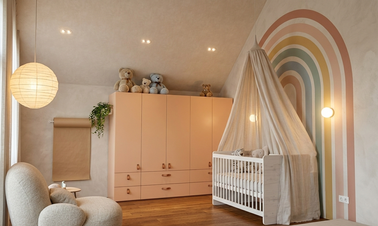Unikalnym detalem w strefie dziennej i sypialnią są wielkoformatowe tapety, które stanowią artystyczny pomost między nowoczesnym wnętrzem a historią regionu. Ich motywy roślinne to bezpośrednie nawiązanie do lokalnych legend o Sobótce oraz mistycznego poszukiwania kwiatu paproci, co nadaje przestrzeni niemal magicznego, nastrojowego charakteru.