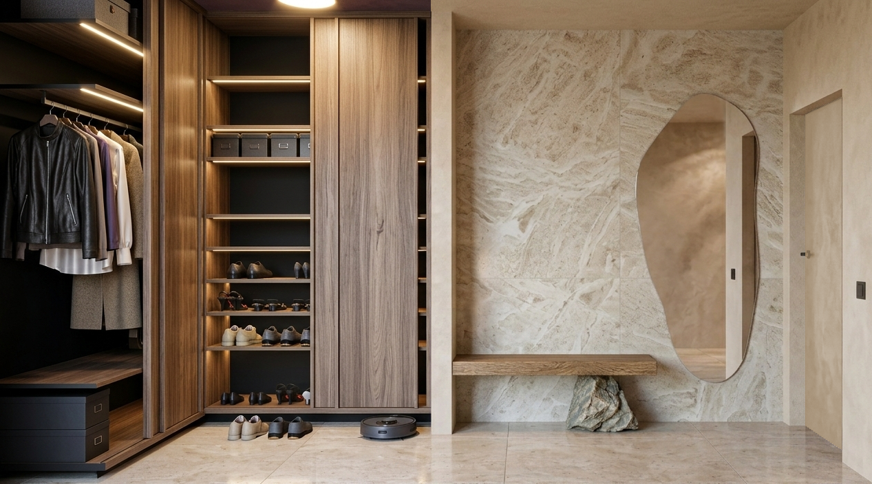 Pokój kąpielowy zaprojektowany tak, by stanowił prywatne spa – z sauną infrared, wykończony wielkoformatowymi płytkami o hipnotyzującym rysunku. Strefa wejściowa łączy surowość z luksusem. Drewniana zabudowa sąsiaduje z siedziskiem wspartym na potężnym, surowym bloku skalnym, co jest ukłonem w stronę geologii i natury pobliskiej góry Ślęży.