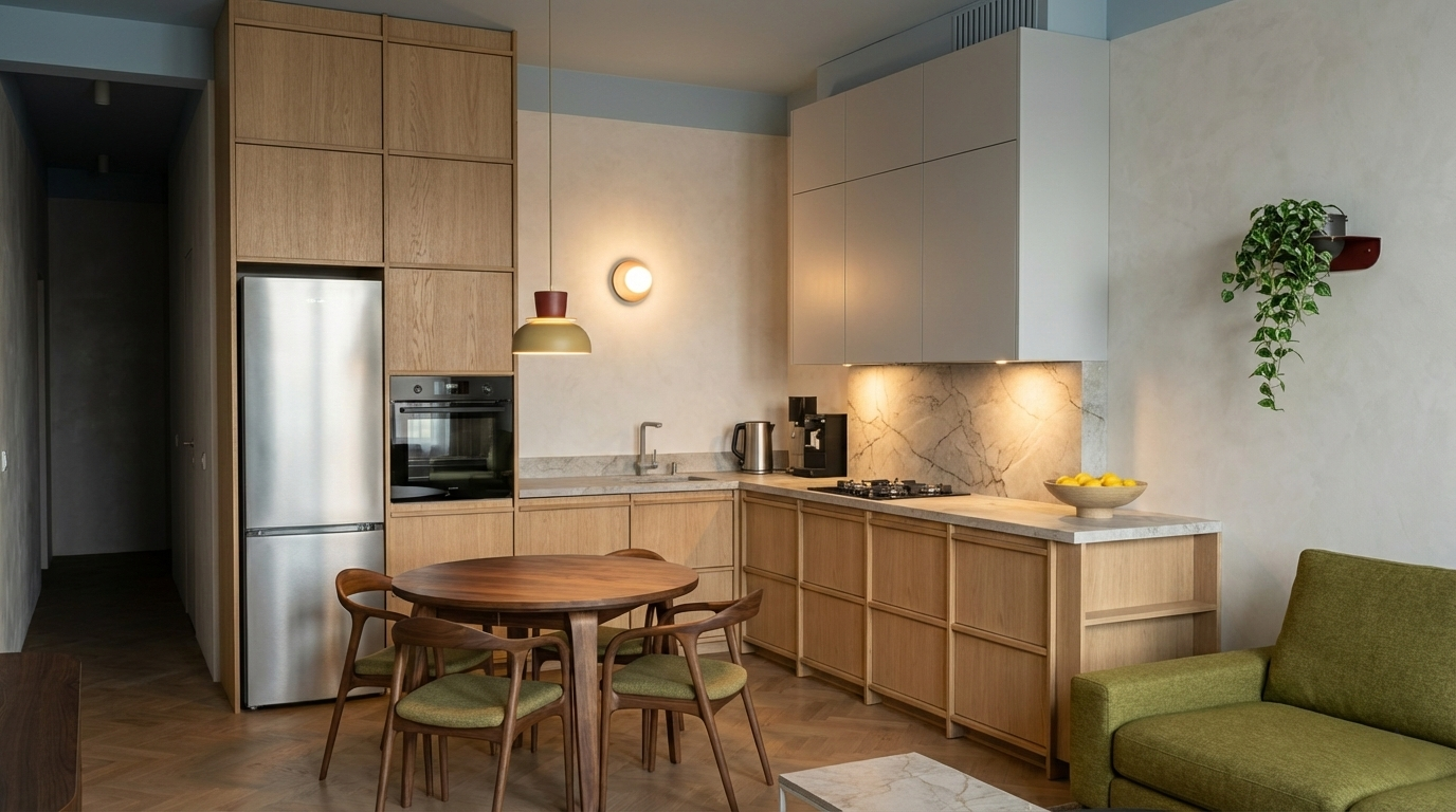 Projekt mieszkania przy ul. Kluczborskiej udowadnia, że wnętrze w kamienicy może zachwycać bez klasycznej sztukaterii. We wnętrzu postawiliśmy na szczerość materiałów i wyraziste kolory, tworząc przestrzeń, która jest jednocześnie nowoczesna i bardzo przytulna.