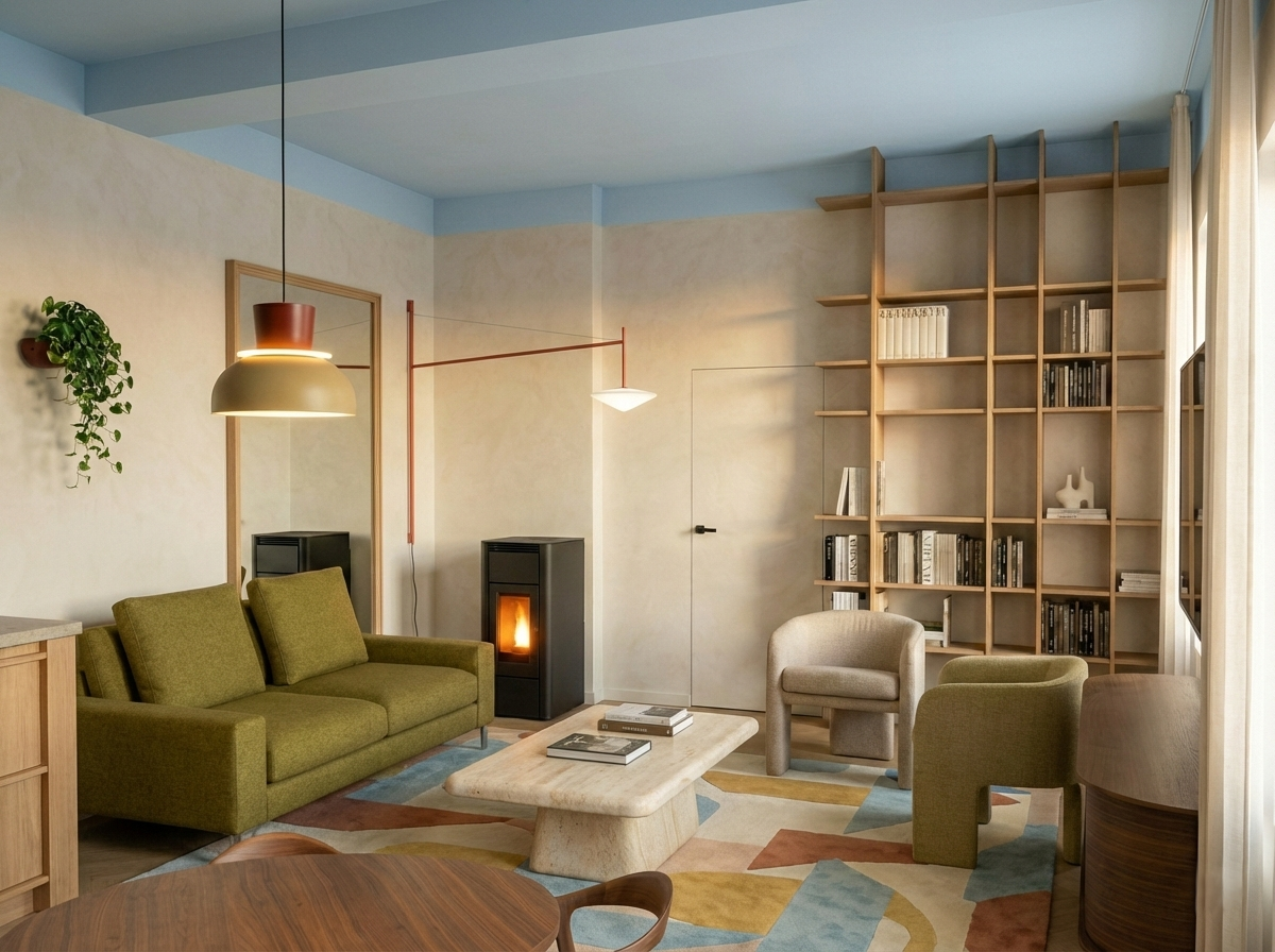 W salonie połączyliśmy lekką sylwetkę sofy z ciężkim, trawertynowym stolikiem kawowym, rzeźbiarskimi fotelami i geometrycznym, kolorowym dywanem. Całość dopełnia minimalistyczny, czarny piec typu koza i ażurowy lekki regał.