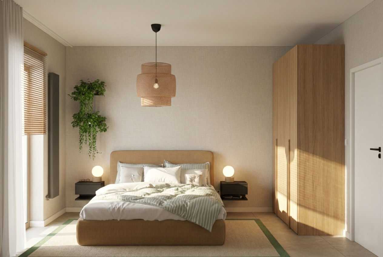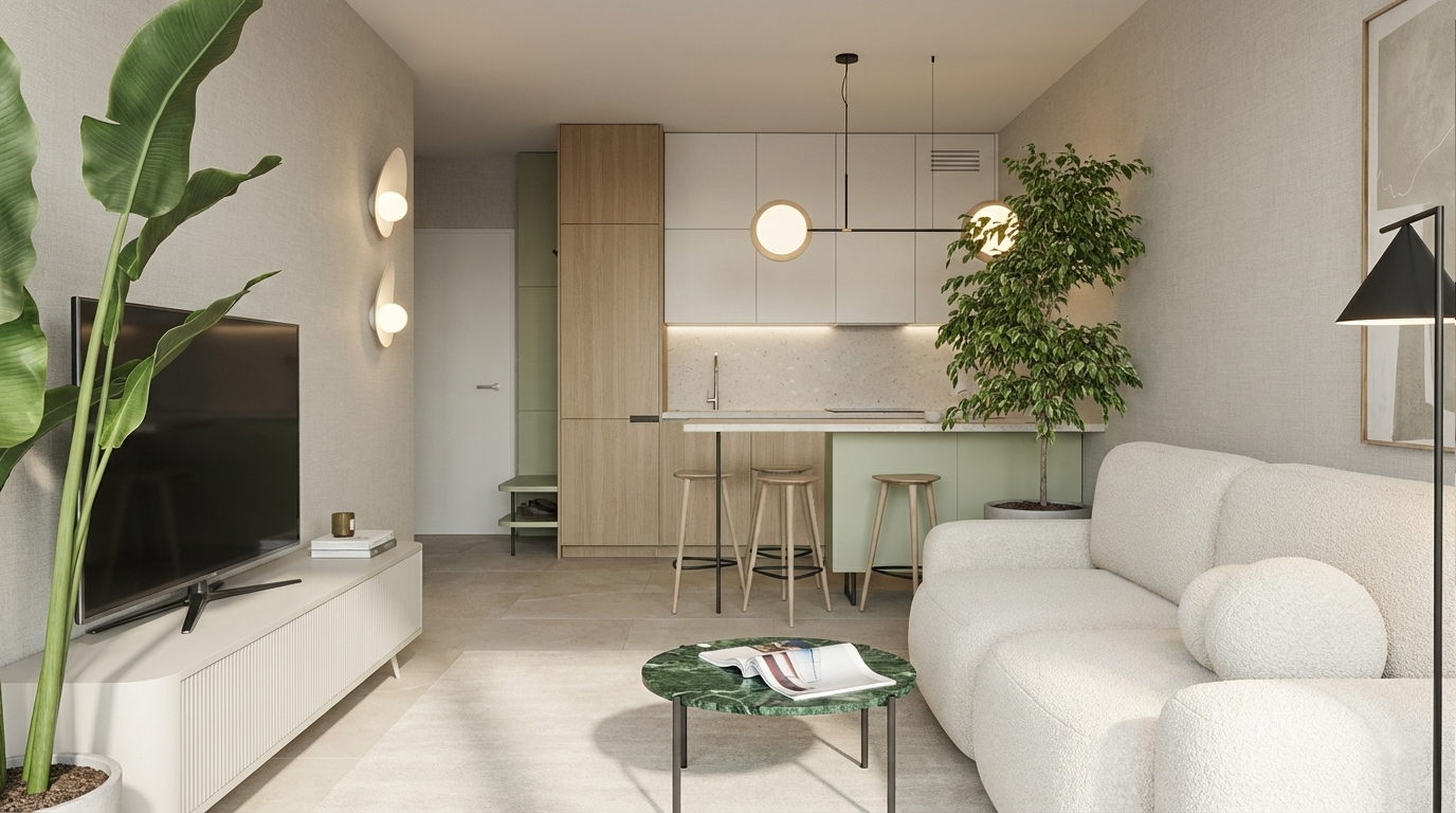 Projekt mieszkania przy ulicy Czystej to przykład tego, jak dzięki przemyślanym decyzjom i dyscyplinie projektowej stworzyć wnętrze pełne stylu przy mniejszych nakładach finansowych. Postawiliśmy na minimalizm, który nie tylko nadaje mieszkaniu nowoczesny i uporządkowany wygląd, ale pozwolił też uniknąć zbędnych wydatków. Cała koncepcja opiera się na spójnej palecie barw, w której dominują jasne drewno, ciepłe beże oraz różne odcienie zieleni – od delikatnej szałwii po głęboki szmaragd.